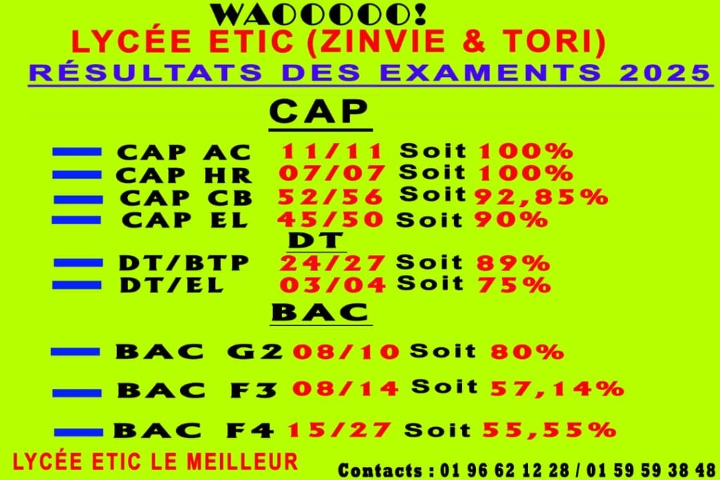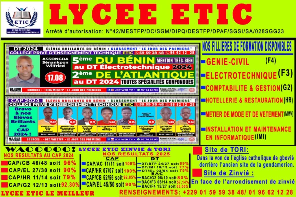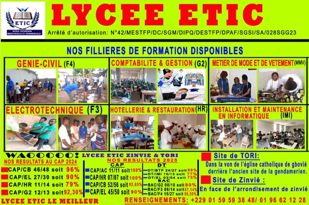 Depuis plusieurs années, le lycée technique ETIC se démarque par son offre exclusivement technique, avec des séries telles que F4, F3, HR, IMI, G2 et MMV, encadrées par des enseignants compétents et des travaux pratiques rigoureusement coordonnés. Ses résultats constants et performants aux examens nationaux rassurent la communauté éducative et confirment sa réputation d’établissement d’excellence.
