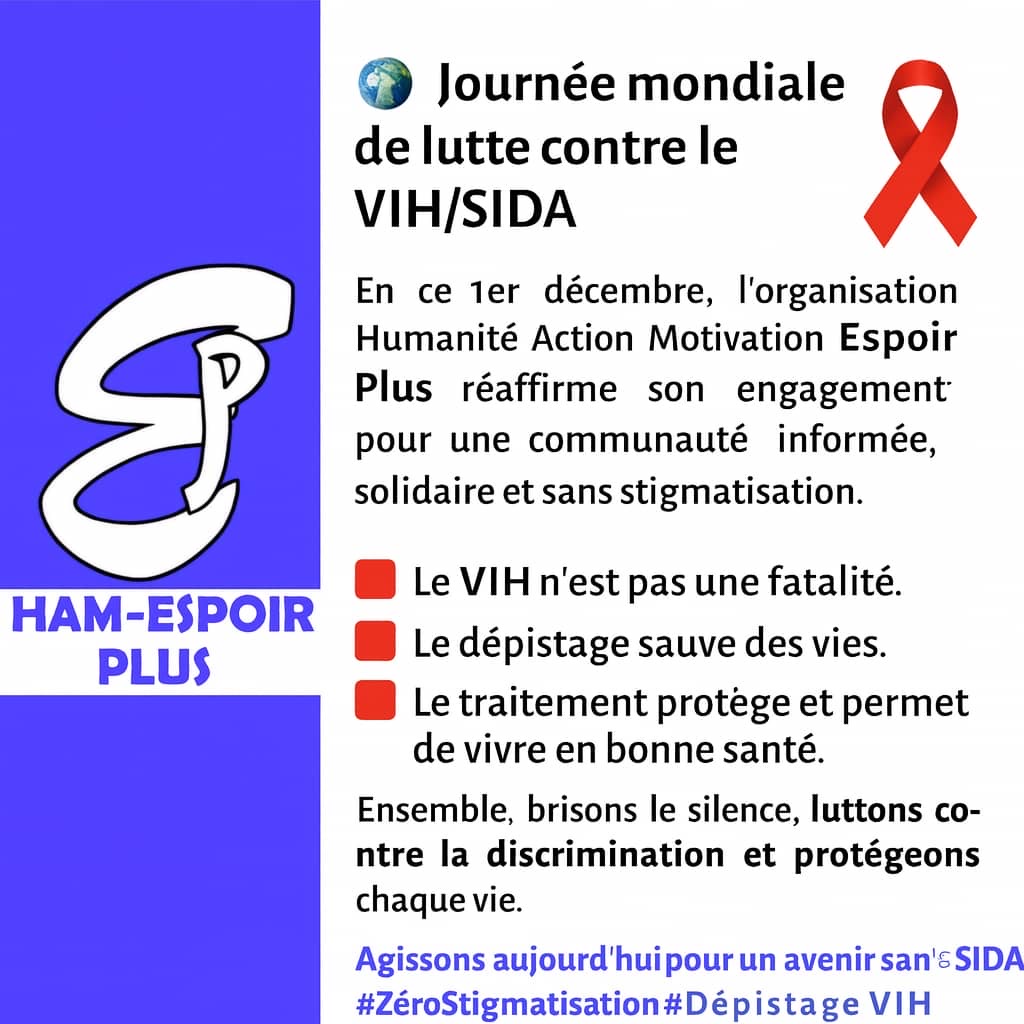 À l’occasion de la Journée mondiale de lutte contre le VIH/SIDA, célébrée chaque 1er décembre, l’ONG Humanité Action Motivation Espoir Plus (HAM-ESPOIR PLUS) a adressé un message empreint d’engagement et d’espoir à la population béninoise. À travers la voix de son Président, M. Moïse A. Houngbedji, l’organisation communautaire a réaffirmé son rôle dans la sensibilisation, la prévention et la lutte contre la stigmatisation liée au VIH.